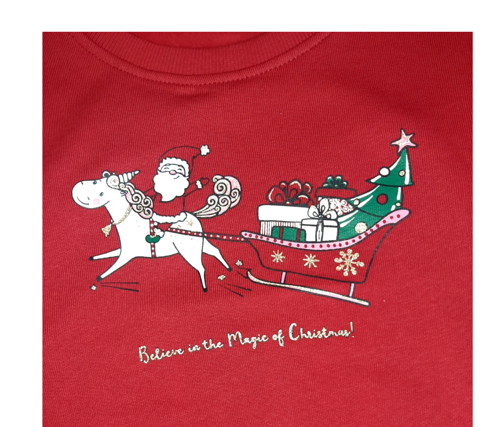 - Color: color rojo con estampado de Papá Noel en trineo y letras doradas